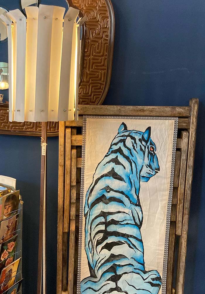 We create custom designs for him, such as the painted fabric for this vintage deck chair.